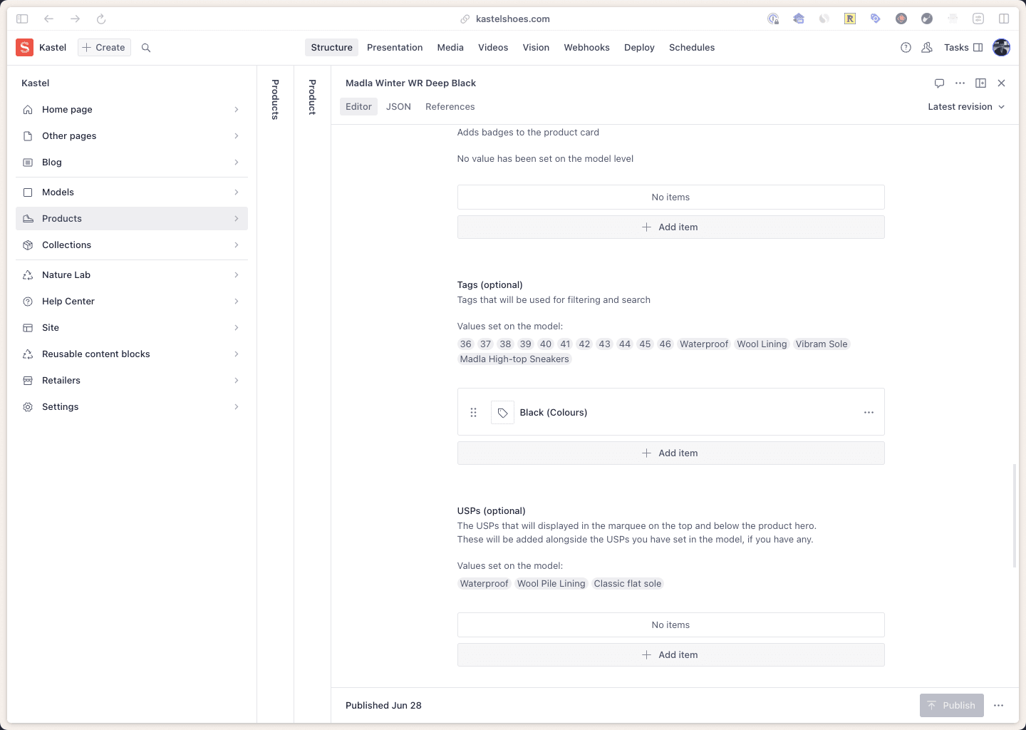 In this page, or document as it's called you can set information that is shared across multiple products. In this case all colorways of the Madla Winter shoe model.